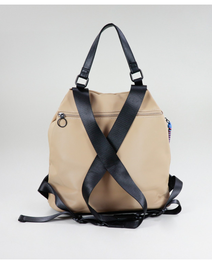 Taupe backpack with multiple pockets in front. It contains several zip pockets and the main and most spacious is behind.