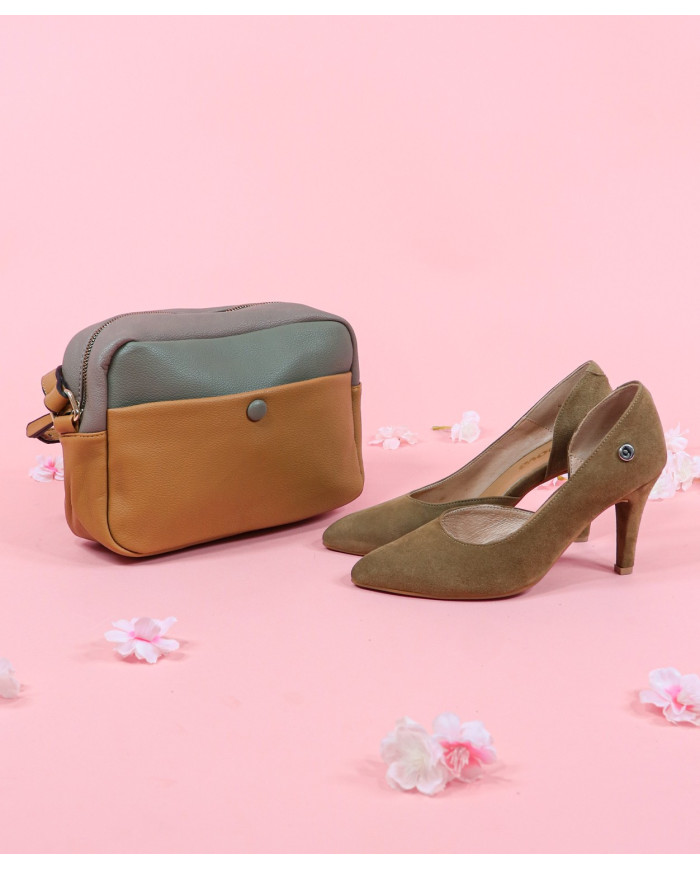 Tricolor case with adjustable handle. It contains a pocket in front, back and inside a bag with zipper.