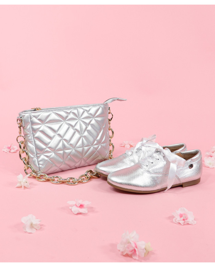 Silver case with shoulder strap in chain. Contains a removable handle that you can use it as a shoulder, cross or shoulder strap. Inside it has a zip pocket.