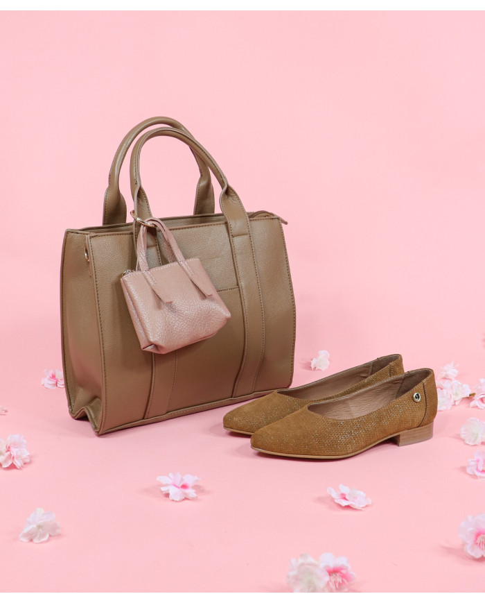 Camel case with mini suitcase. It contains in the interior two pockets, one zipper and another free.