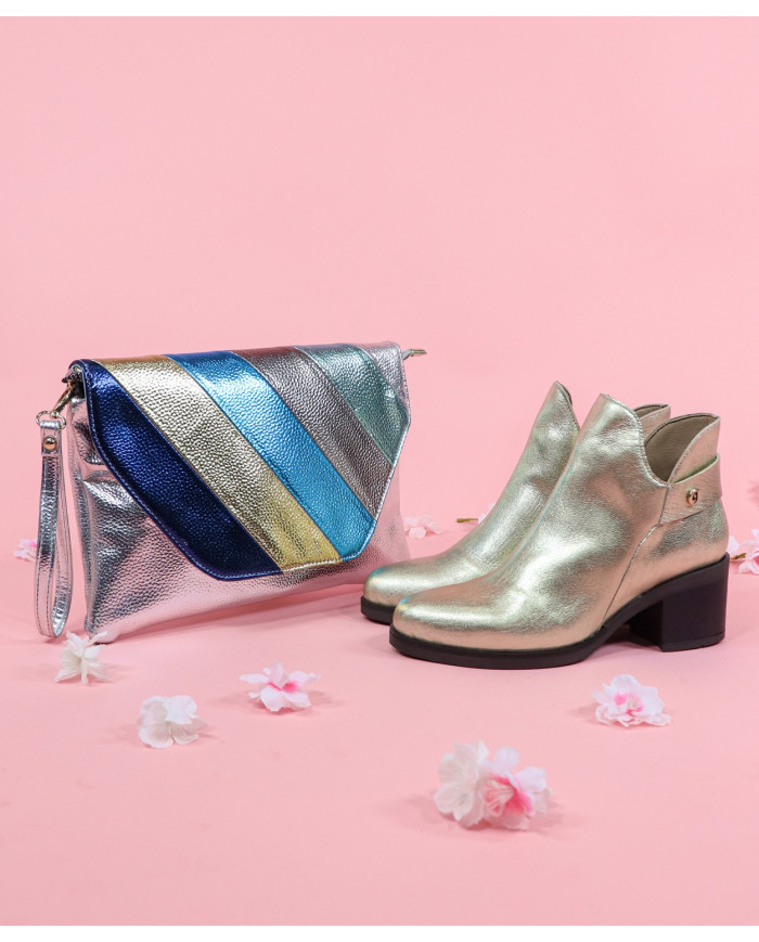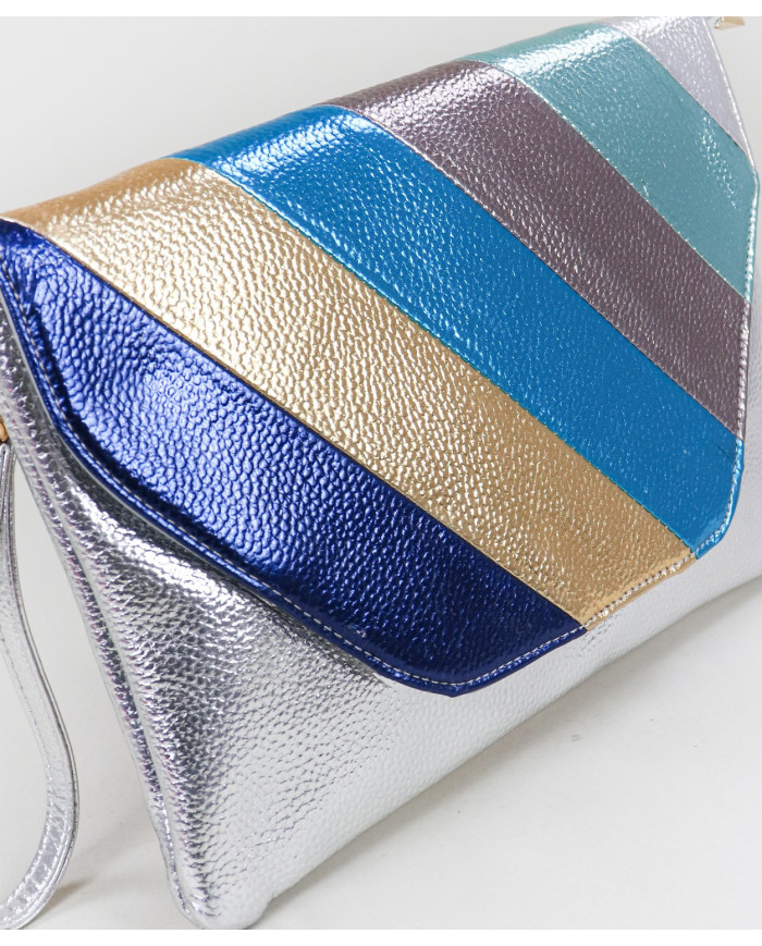 Hand Clutch with metallic finish. This model contains a removable adjustable handle. With small inner pocket.