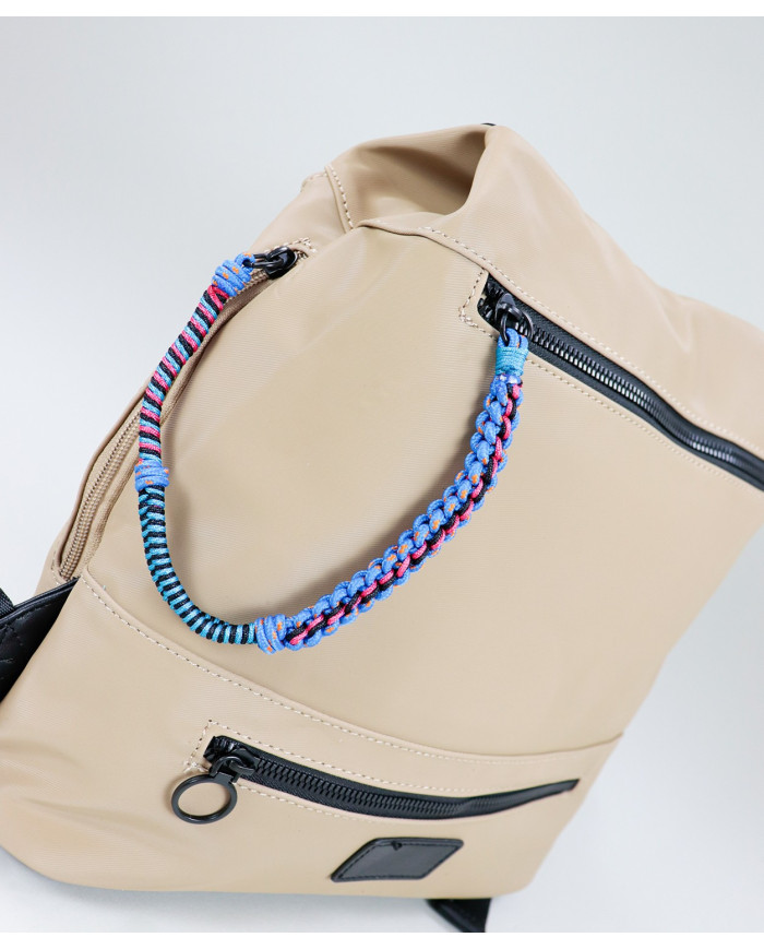 Mochila Taupe con múltiples bolsillos delante. Contiene varios bolsillos de cremallera y el principal y más espacioso está detrás.