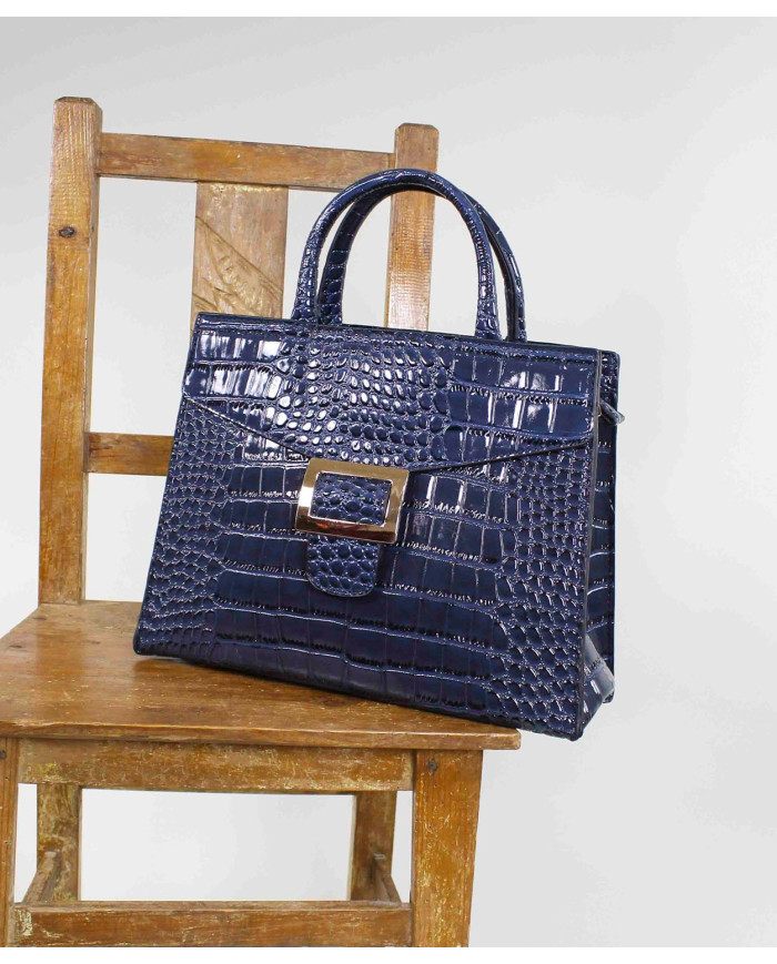 Caja de mano en barniz con textura y hebilla. Dentro contiene un bolsillo con cremallera.