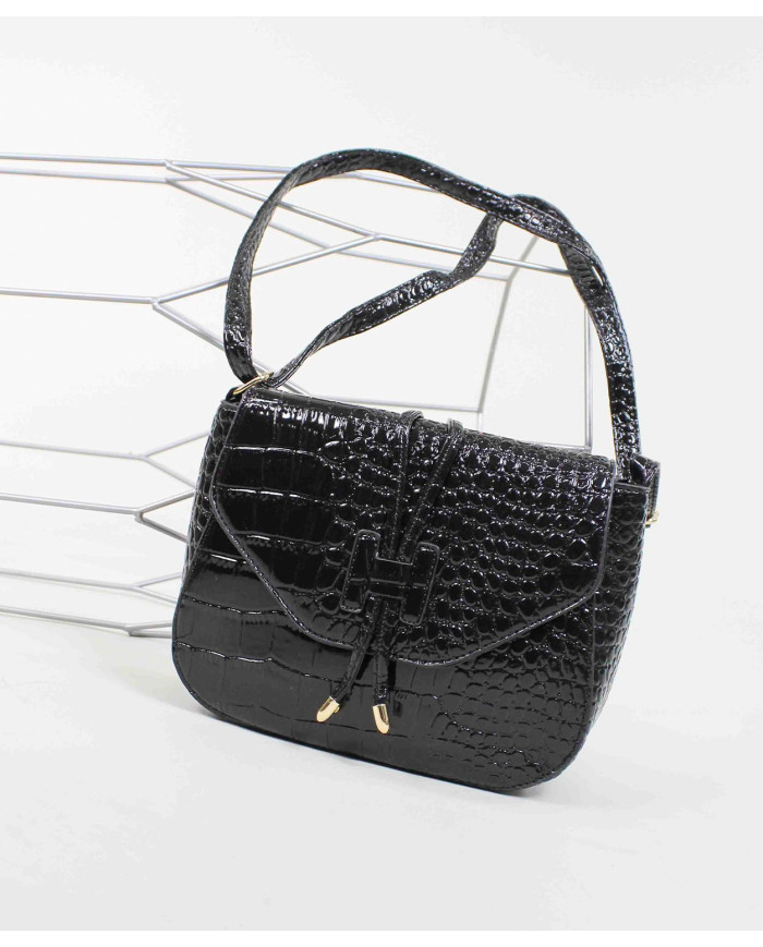 Funda lacada con textura y detalles metálicos. Dentro contiene un bolsillo con cremallera.