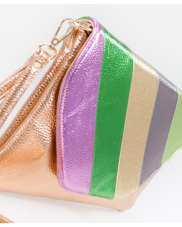 Bolso de mano con acabado metálico. Este modelo contiene una correa ajustable extraíble. Con pequeño bolsillo interior.