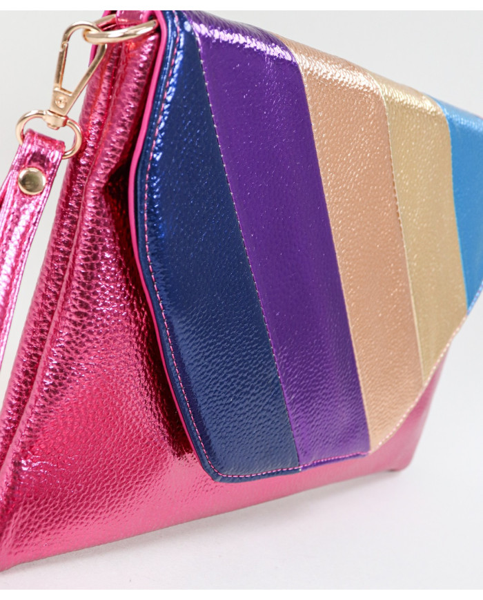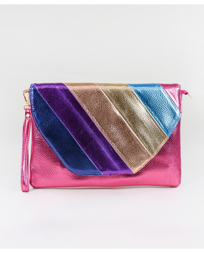 Bolso de mano con acabado metálico. Este modelo contiene una correa ajustable extraíble. Con pequeño bolsillo interior.