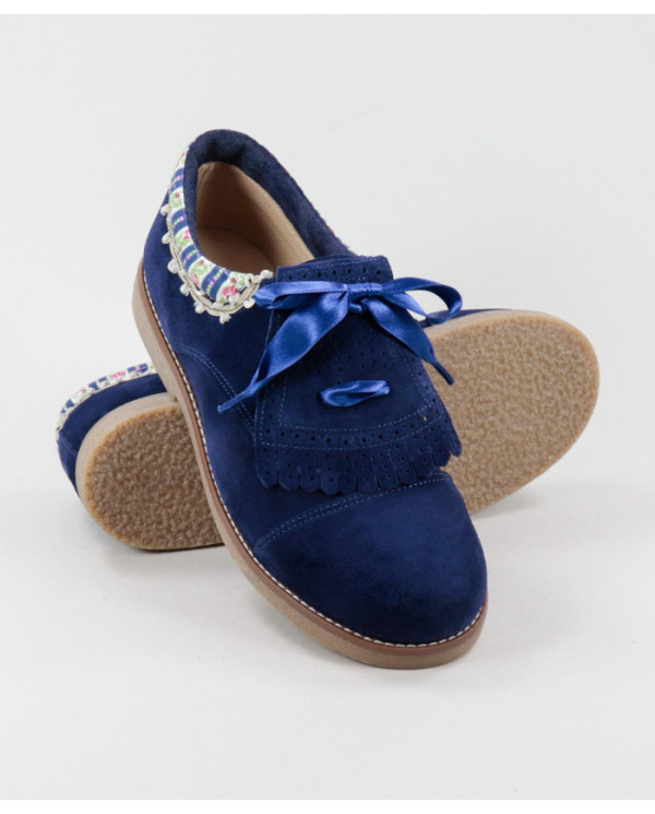 Zapatos bajos de piel resfriada, con flecos y arco satinado. El tejido en la espalda hace este modelo adorable y difícil de resistir.