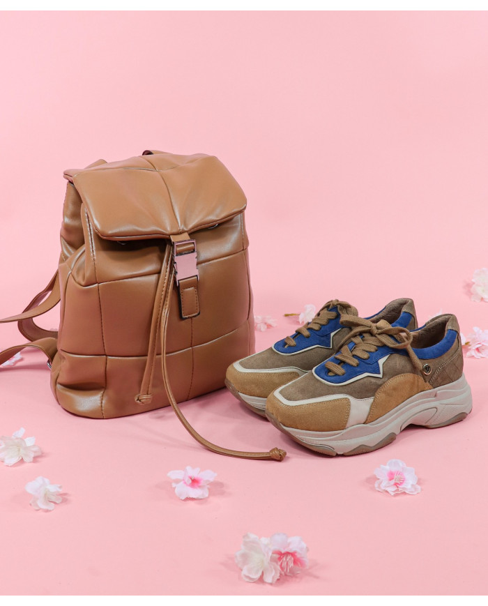 Mochila camel com cordões ajustáveis. Contém um bolso no interior com fecho e um compartimento para telemóvel.