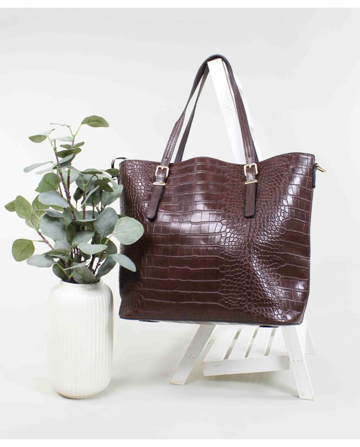 Mala de Senhora estilo shopper com textura croco. Contém mini bolsa e inclui uma alça removível para usar a tiracolo. O seu interior tem 3 divisórias.