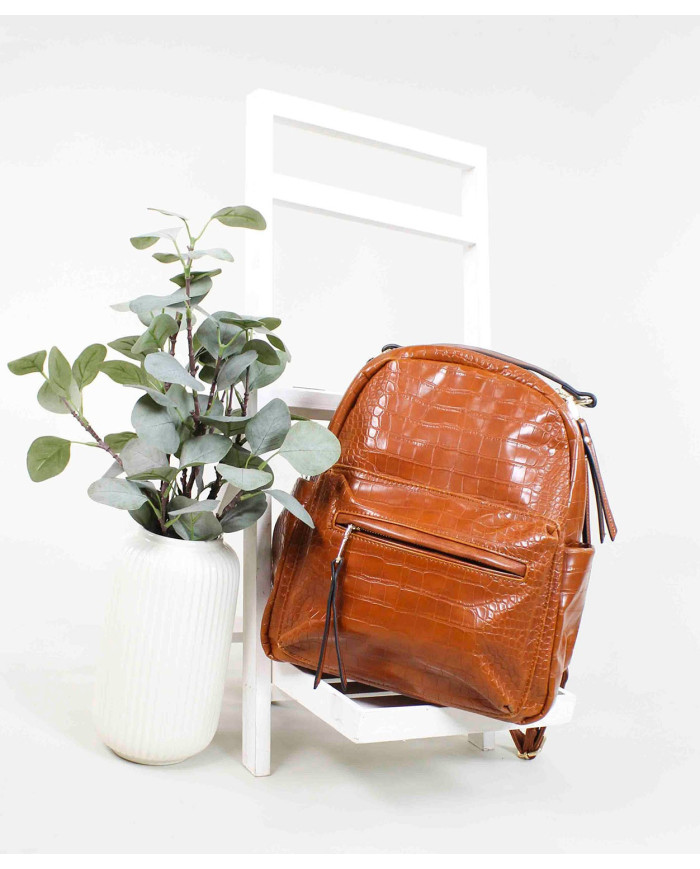 Mochila com textura croco. Contém um bolso no interior com fecho, e um compartimento à frente e outro na parte de trás.