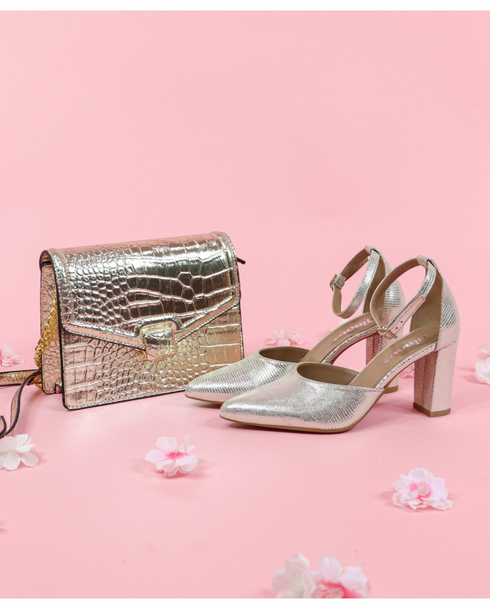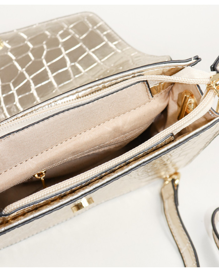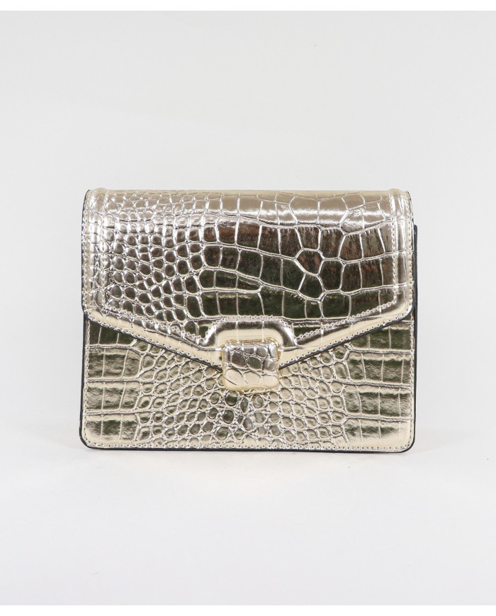 Mala com acabamento metalizado. A alça é ajustável para usar de ombro ou tiracolo. Com pequeno bolso interior.