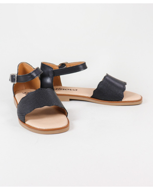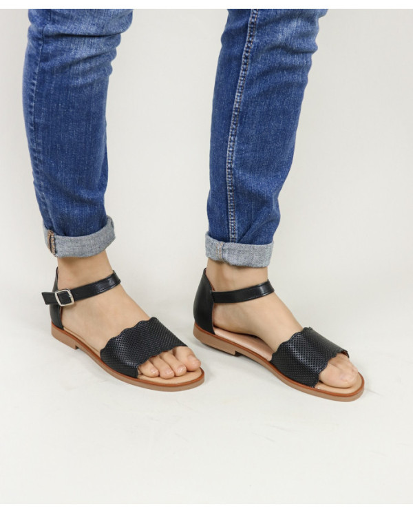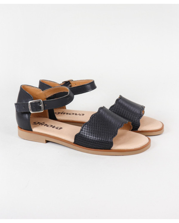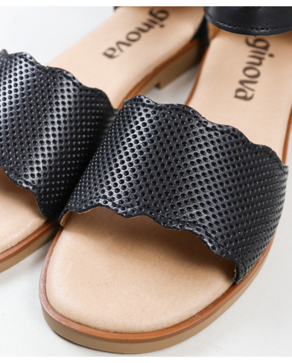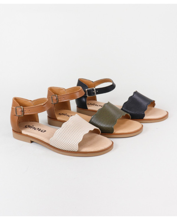 Sandálias rasas Ginova com tiras perfuradas em pele para quem gosta de caminhar com conforto.