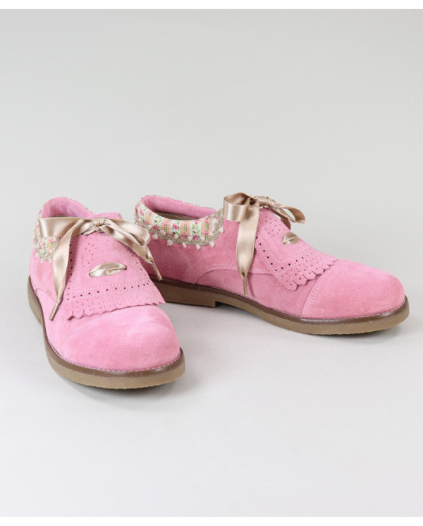 Sapatos baixos de pele carneira Ginova de Mulher, com franjas e laço de cetim. O tecido na parte de trás, torna este modelo adorável e difícil de resistir.