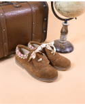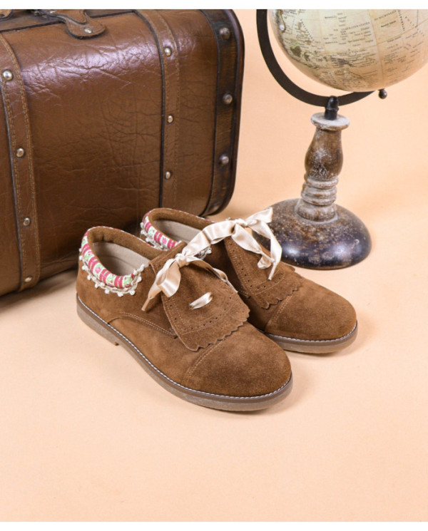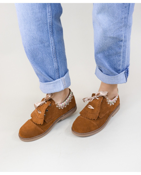 Sapatos baixos de pele carneira Ginova de Mulher, com franjas e laço de cetim. O tecido na parte de trás, torna este modelo adorável e difícil de resistir.