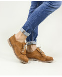 Sapatos baixos em pele de carneira, com franjas e atacadores. As franjas, tornam este modelo super adorável e difícil de resistir. Disponível nas cores taupe, camel, rosa e azul.