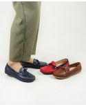 Mocassins de Mulher com cordão na frente. Este calçado tem a pele maleável, um modelo simples com palmilha em pele almofadada. Disponível nas cores azul e castanho.